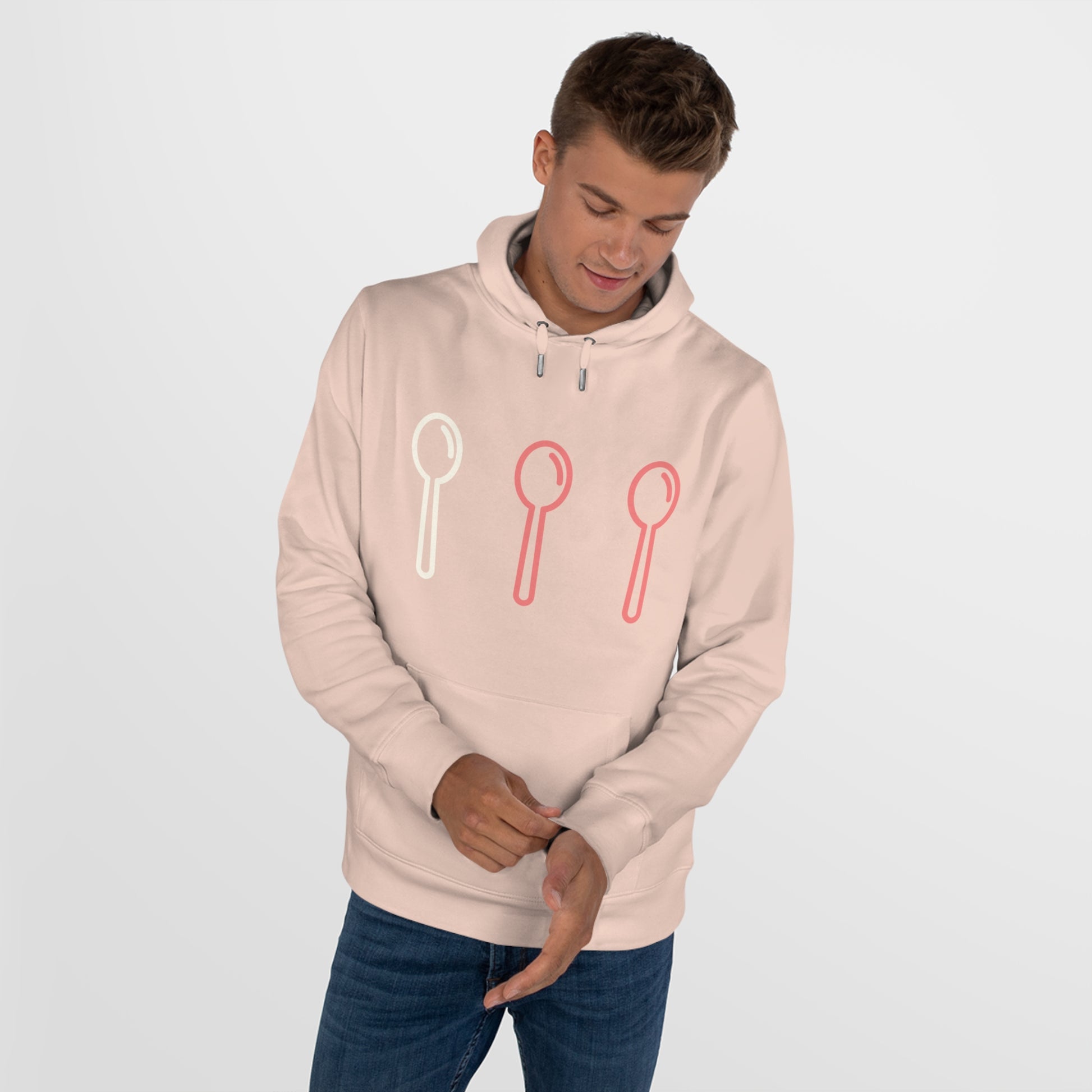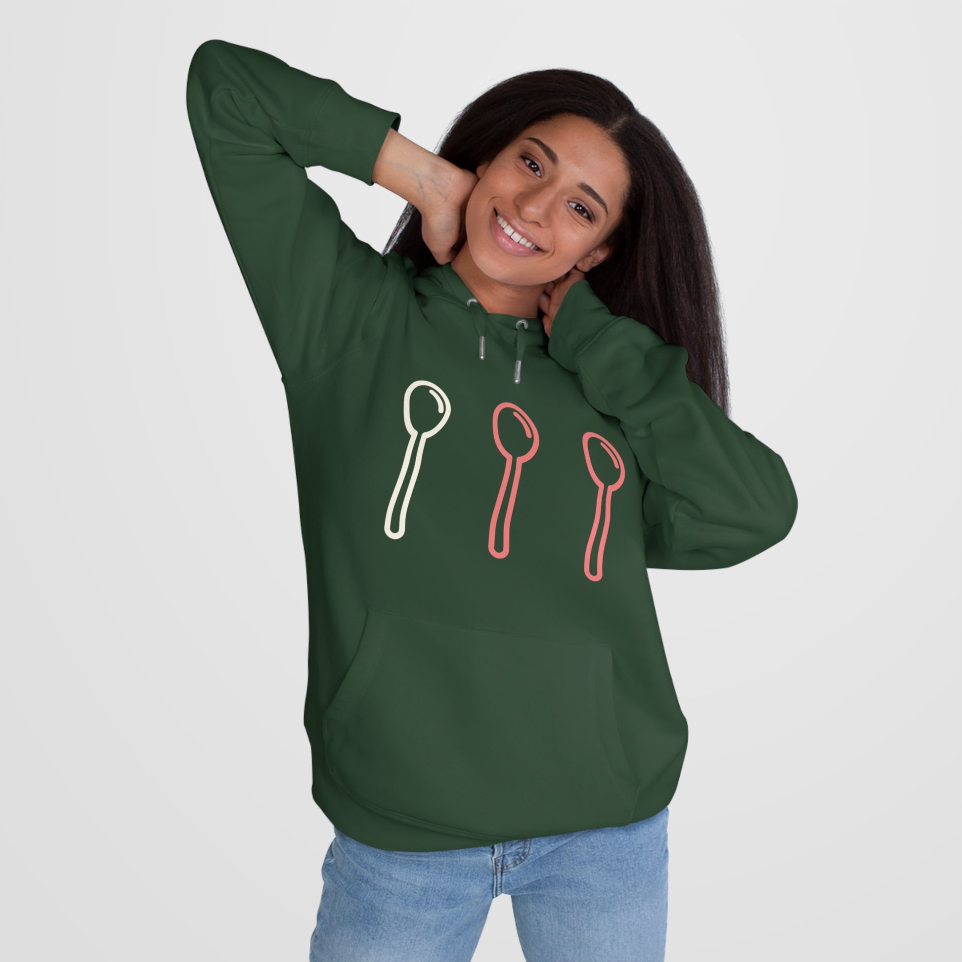 Deze zachte, warme hoodie is precies wat je nodig hebt op dagen waarop je extra comfort kunt gebruiken. Met een minimalistisch design en een speelse print met drie lepels brengt hij een vleugje luchtigheid en humor in je dag, zonder dat je er moeite voor hoeft te doen. Perfect om lekker thuis in weg te kruipen, of om je comfortabel en stijlvol te voelen tijdens de momenten waarop je naar buiten gaat.